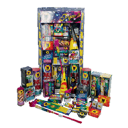 PYRO 3 A great Black Cat Family Pack that includes a great variety of small, medium and large size fountains, novelties, smokes and more. |
