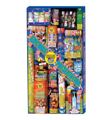 ENCORE PRESENTATION This one's loaded......over 30 fountains in one pack. If you're looking for the ultimate safe-n-sane tray assortment, look no further. More than enough for a night filled with quality fountains to keep the kids smiling. Bring some help to load this one, you'll need it. |